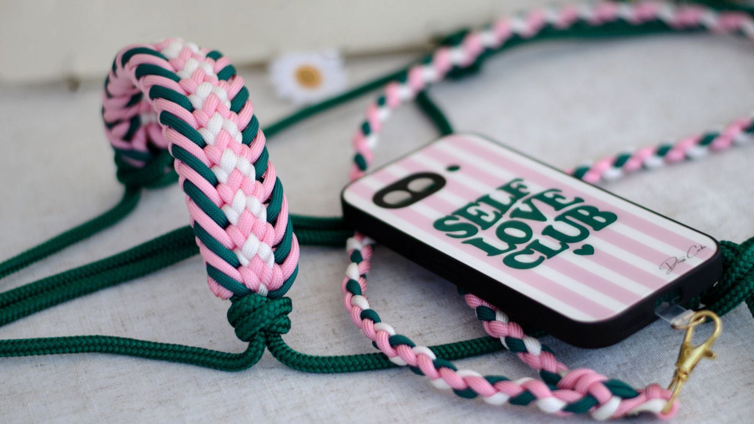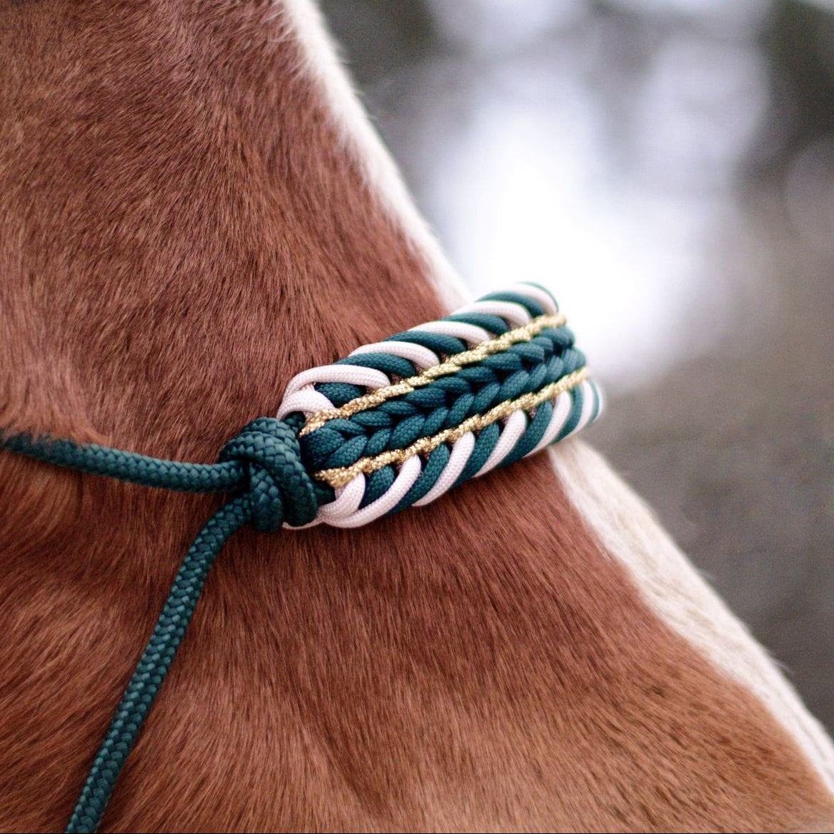 Ici un licol éthologique avec l'ensemble coque SelfLoveClub et son cordon accordé. Pour un ensemble complet il est possible d'ajouter le collier chien.